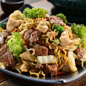 Acompanham Arroz com Brócolis, Salada mista e Fritas.