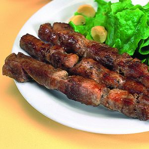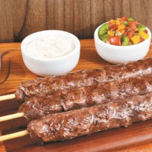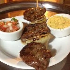 Carne, Coração e Linguiça. Acompanha com Farofa e Molho