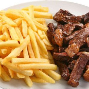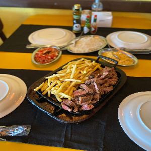 Aproximadamente 500 gr picanha fatiada. Acompanha fritas