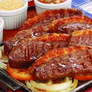 Carne, Frango, Porco e Linguiça. Acompanha com Farofa e Molho